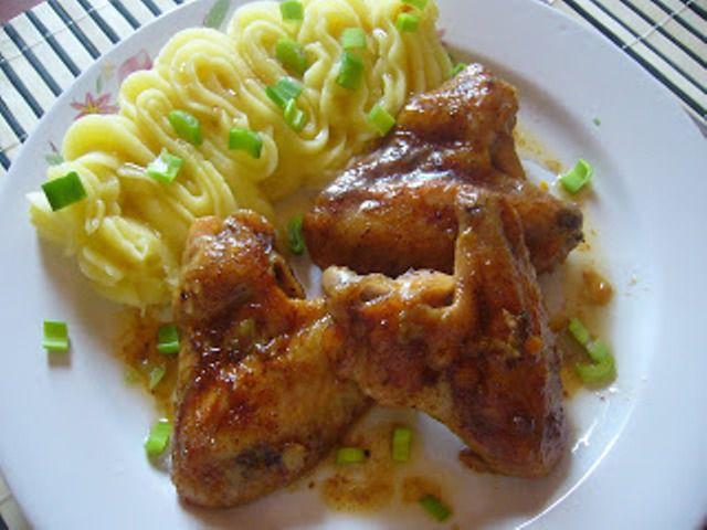 Mod de Preparare: Curatam si spalam aripioarele, le asezam intr-o tava, condimentam, tocam usturoiul marunt, turnăm vinul si punem folie de aluminiu pe tava... facem cateva gaurele cu o scobitoare si introducem tava la cuptor cca 20 min... intre timp curatam cartofii ii punem la fiert in apa cu sare... dupa 20 min scoatem tava cu aripioare, luam folia si mai bagam la cuptor 10 min... cand sunt fierti cartofii, ii scurgem de apa, ii zdrobim si adaugam unt si lapte, mixam putin... servim aripioarele cu piureul si sosul de vin cu usturoi. Pofta buna!