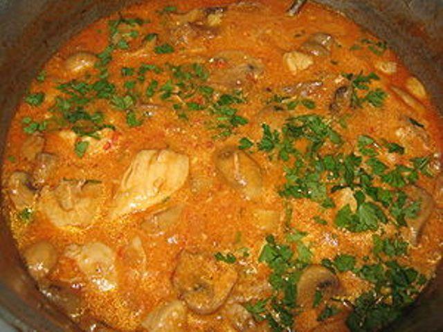 Mod de Preparare: Am tocat toate legumele. Ceapa si morcovul mai marunt iar ciupercile in 4-6. Puiul l-am taiat cubulete potrivite. In putin ulei de masline am calit ceapa pana a devenit translucida. Cu ceapa am calit si cubuletele de pui. Morcovul taiat cubulete mici l-am calit cu ceapa si puiul apoi am adaugat ciupercile. Ciupercile lasa apa asa ca am mai adaugat doar o jumatate de cana. Am acoperit cratita cu un capac sa se inabuse pentru 5 minute apoi am luat capacul sa scada apa. Se fac foarte repede asa ca dupa 15 minute am adaugat bulionul si am mai tinut pe foc inca 10 minute. Se poate adauga putin faina daca va place sosul mai legat. Mie mi-a fost suficient de legat datorita bulionului. Cand am fost gata am adaugat mararul tocat marunt.