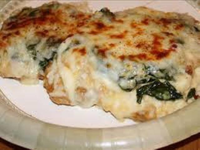Mod de Preparare: Incingeti cuptorul la 200 grade. Intr-o farfurie bateti oul cu apa; intr-o alta fafurie amestecati faina cu sarea si piperul. Dati pieptii de pui prin faina, apoi prin mixul de ou si apa. Incingeti cele 3 linguri de ulei de malsine intr-o tigaie; prajiti pieptii pe fiecare parte 3-4 minute, asezatii apoi intr-o tava de cuptor. Spalati tigaia, uscati-o si incingeti cele 2 linguri ulei de malsine. Caliti ceapa verde si spanacul pana cand acesta (spanacul) se inmoaie. Adaugati smanatana, supa de pui si smantana si lasati sosul sa fiarba 10-12 minute, apoi turnati-l peste pieptii de pui prajiti si pusi in tava de cuptor. Presarati deasupra mozzarella rasa in mod egal si dati tava in cuptorul incins timp de 5 minute sau pana cand branza s-a topit si este rumenita. Pieptul de pui cu spanac si mozzarella se serveste alaturi de o salata simpla.