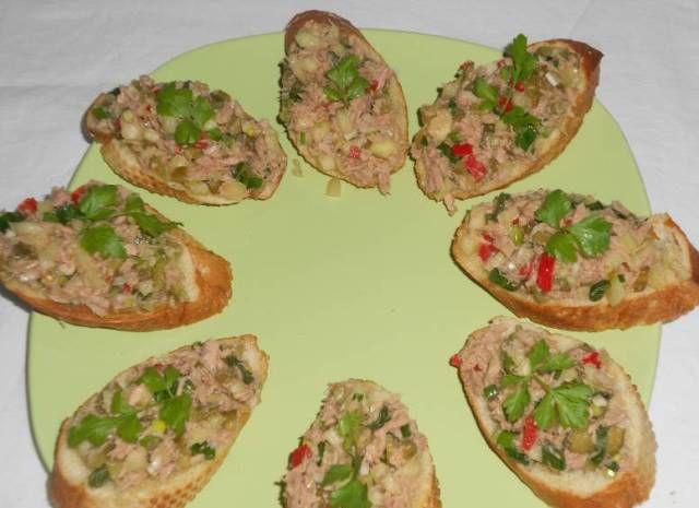 Mod de Preparare: Se taie feliile de paine de marimea unor bruschete. Feliile de paine taiate se pun la prajit pe gratar sau pe plita sa se rumeneasca si sa se faca cam ca si bruschetele Se desface conserva de ton si se lasa la scurs de ulei. Se iau 3 rosii, se taie marunt, se pun in blender impreuna cu sarea si cele 3 linguri de ulei de masline si se porneste blender-ul pana cand se face ca o pasta. Se ia o felie de paine prajita (sau bruschete), se pune pasta de tomate pe ea apoi bucatele de ton scurs de ulei (sau orice alt peste din conserva ce va place) apoi se taie salata foarte marunt si se pune peste peste sau masline.