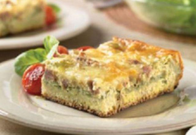Mod de preparare: Cubuleţele de pâine se întind uniform într-o tavă adâncă, unsă cu puţin unt. Se adaugă, în strat, ceapa, crenvurștii, brânza şi brânza cașcavalul. Într-un castron se amestecă ouăle cu lapte, sare şi piper. Se toarnă peste brânză, apoi se uniformizează. Se dă la rece cel puţin o oră. Plăcinta se coace 60 de minute, la 180 de grade Celsius. Când capătă o culoare aurie şi trece proba cu scobitoarea, se scoate şi se porţionează. Plăcinta se seveşte caldă.