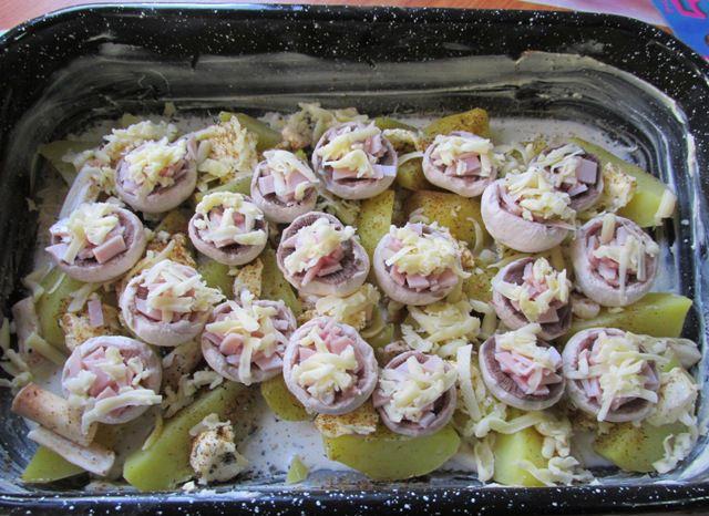 Mod de Preparare: Pentru inceput spalati bine cartofii, daca sunt noi, ar fi mai ok sa-i fierbeti intai si apoi sa-i bagati la cuptor. Din cauza ca ciupercile se coc mai repede decat cartofii, nu puteti lasa foarte mult la cuptor, iar cartofii de la suprafata or sa fie putintel mai tari decat restul. Ungeti tava cu unt, asezati cartofii, taiati coditele de la ciuperci in doua (logic, spalati ciuprcile prima data) si le asezati peste cartofi, taiati bucatele de unt si le distribuiti egal in tava, turnati laptele, presarati condimentul pentru cartofi, apoi presarati cascavalul sau amestecul de branzeturi. Asezati palariile de ciuperci peste ce aveti deja in tava, taiati sunca sau kaizerul cubulete mici si puneti in fiecare ciuperca 3-4 cubulete, apoi presarati cascaval sau amestec de branzeturi peste ciuperci. Ultimul pas consta in amestecarea celor doua oua si cu o furculita puneti putin ou pe fiecare ciupercuta si ce va ramane turnati printre ele, pe cartofi. Incingeti cuptorul vreo 10 minute inainte de a baga tava la cuptor, iar de lasat le lasati pana se rumenesc ciupercile si incercati cartofii cu o furculita. Daca nu pot fi patrunsi usor mai lasati sa se coaca, ciupercile chiar si rumenite bine vor avea un gust foarte bun. Teoretic ar dura cam o ora. Daca sunt cartofii fierti in prealabil o sa dureze mai putin. Este o mancare destul de usoara, cartofii vor imprumuta mult din gustul untului, laptele o sa le dea un gust dulceag, numai bun, iar ciupercile sunt divine…