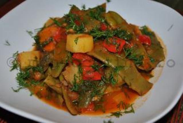 Mod de preparare: Tocati ceapa si morcovul si caliti-le in putin ulei. Adaugati cartofii cubulete cand ceapa e sticloasa. Adaugati o cana de apa si lasati sa fiarba la foc mediu. Dupa 10 minute adaugati fasolea verde. Dupa ce a fiert si fasolea vreo 10 minute, adaugati rondelele de dovlecei si ardeii taiati fasiute. Lasati sa fiarba impreuna inca 5 minute, eventual mai completati cu apa. Cand toate legumele sunt aproape fierte, adaugati sucul de rosii. Lasati sa mai fiarba cateva minute, pana scade sosul. La final, adaugati mararul si patrunjelul tocat. Amestecati si gata ghiveciul de legume. Se serveste cald.