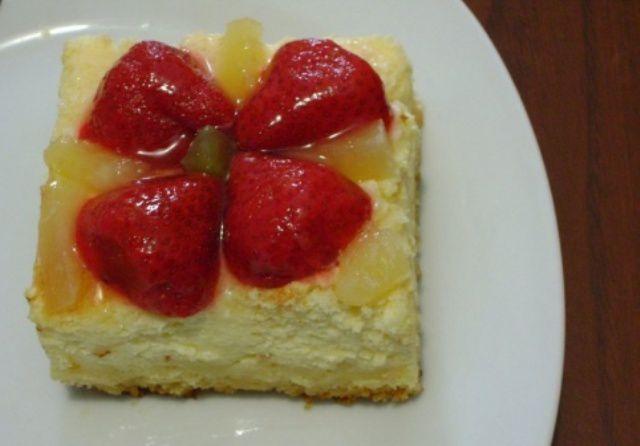 Cand prajitura este gata o lasam sa se raceasca si apoi o decoram cu fructe din compot scurse foarte bine. Cu sucul de la compot facem gelul care se toarna peste fructe.