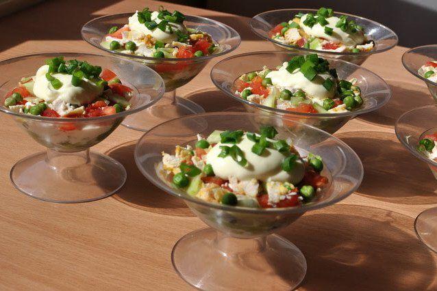 Mod de Preparare: Fierbem mai intai ouale, apoi le lasam la racit. Intre timp spalam si curatam legumele, apoi morcovul deja curatat il dam pe razatoare. Pieptul de pui il taiem cubulete mici, iar ceapa verde se taie rondele marunte. Oualor racite le separam albusul de galbenus si le dam pe razatoarea mica, pe fiecare in parte. In 3 sau 4 cupe (depinde cat de mari sunt), punem alternativ, un strat de frunze de salata, ceapa verde apoi pieptul de pui, morcovul, porumbul, albusurile si galbenusurile, iar la final decoram cu feliute de rosie!