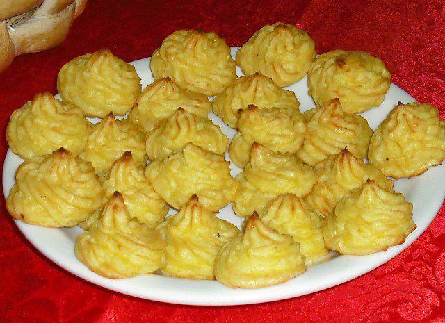 Mod de Preparare: Curatam cartofii pe care apoi ii taiem cubulete. Intr-o oala punem cartofii la fiert cu un praf de sare. Cand s-au fiert cartofii, se lasa la racit putin. Apoi pasam cartofii printr-o strecuratoare sau ii mixam la robot. Se adauga sare dupa gust, unt, piper. Se adauga un ou si un galbenus si parmezanul ras. Celalalt albus il batem spuma tare. Se pune in tava de la aragaz hartie de copt. Cu o forma speciala de prajituri se spriteaza mici stelute, care apoi se ung cu albusul batut. Se baga la cuptor si se tin pana se rumenesc usor deasupra. Sunt buni atat calzi cat si reci.