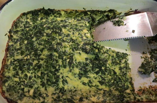Cand este aproape gata, se adauga ciupercile si se mai calesc cateva minute. Intre timp cartofii se curata de coaja, se taie bucatele mici si se amesteca cu ceapa si ciupercile. Intr-o tigaie calim usturoiul si adaugam spanacul pe care il calim cateva minute. Batem oulalele spuma si le adugam peste spanac. Amestecam usor spanacul cu cartofii. Condimentam cu sare si piper. Punem totul intr-o tava unsa cu unt (ulei) si dam la cuptor pentru 30-40 minute. Servim fierbinte.