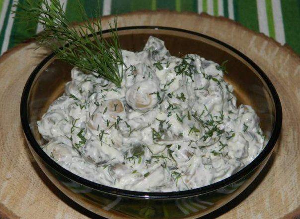 Mod de Preparare: Ciupercutele, castravetele, salamul si oul fiert se taie cubulete. Se amesteca ciupercile, oul, castravetele, salamul, se pune piper si usturoiul tocat fin sau presat. Maioneza se amesteca cu smantana, dupa care se amesteca toate ingredientele. Se potriveste de sare.