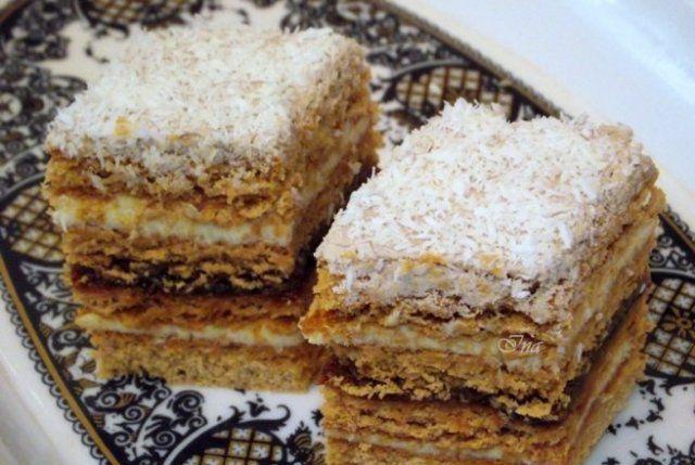 Asamblam prajitura: foaie, crema, foaie, gem, foaie, crema, foaie. Asezam un fund de lemn, o greutate, peste prajitura si o dam la rece peste noapte. Presaram zahar farin si o portionam. Frageda si gustoasa!