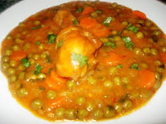 Mod de Preparare: Pieptul de pui se pune la fiert în apă rece cu un praf de sare și se fierbe 20 minute. Când este gata se stoate și se lasă la zvântat. Se tranșează fâșii lungi. Se încinge puțin ulei într-o tigaie și se rumenește bine pe toate părțile, după care se scoate și se păstrează la cald. În uleiul rămas călim foarte puțin ceapa tocată mărunt. Adăugăm mazărea congelată și amestecăm bine. Turnăm apă fierbinte cât să acopere mazărea și lăsăm să fiarbă 10-15 minute în funcție de mazăre. (verificăm după 10 minute dacă este fiartă, în caz contrar se mai lasă 5 minute). Adăugăm roșiile din conservă cu tot cu sos și mărarul proaspăt tocat mărunt și mai lăsăm 5 minute pe foc. Condimentăm cu sare și piper. Aducem carnea în cratiță și acoperim până la servire. La servire se ornează cu mărar proaspăt tocat. Poftă bună!