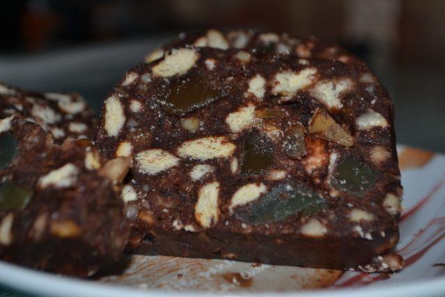 Mod de Preparare: Amestecam laptele cu zaharul si cacaoa si le punem pe foc sa se incalzeasca si sa se topeasca zaharul. Cand s-au infierbantat, adaugam si untul si amestecam continuu apoi luam de pe foc si lasam sa se raceasca. Adaugam si vanilia cand s-a racit. Faramam biscuitii cu mana sau cu un facalet. Prajim putin nuca intr-o tigaie teflonata si apoi o frecam putin in palme ca sa se scuture de cojite. Punem biscuitii, nuca, stafidele si caisele confiate (pe care le-am taiat) intr-un bol si turnam siropul de lapte, zahar, unt si cacao peste acestea amestecand pana cand se leaga. S-ar putea sa nu fie nevoie de tot siropul. Pe o folie de plastic presaram zahar pudra si punem jumatate din compozitie, ruland dintr-o parte si din alta ca sa scoatem aerul din salam. Dupa ce l-am uniformizat, legam salamul la capete cu sfoara si dam la frigider pana se incheaga (cca 2 ore). Procedam la fel si cu cealalata jumatate de compozitie.