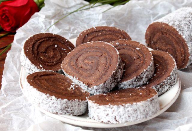 Mod de Preparare: Punem apa la fiert impreuna cu zaharul. Cand incepe sa se formeze spuma deasupra, punem untul si amestecam pana se topeste. Adaugam si cacao, dam deoparte de pe foc si adaugam si laptele praf si esenta de rom. Dupa ce s-a copt blatul, il rasturnam pe un prosop umed presarat cu zahar, ca sa nu se lipeasca. Rulam cu grija si lasam cateva minute la aburit. Derulam si ungem cu ciocolata fierbinte. Rulam din nou si lasam la racit. Intre timp topim ciocolata impreuna cu frisca. Dupa ce s-a racorit, acoperim rulada. Ciocolata alba o punem intr-o punga pe care o tinem cateva minute in apa fierbinte. Taiem la un colt si „spritam" peste rulada "imbracata" in negru. Tavalim prin nuca de cocos si au iesit cateva bombonele delicioase.