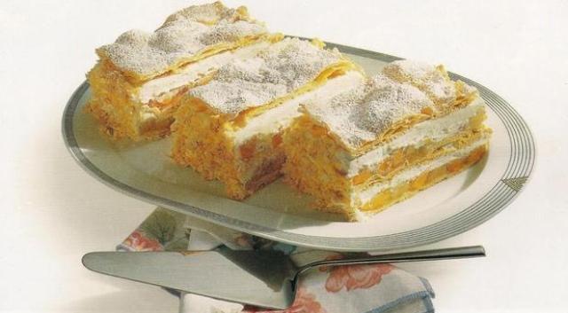 Mod de Preparare: Se tapeteaza o tava cu hartie de copt. Se incinge cuptorul la 220°C (200°C cu ventilator sau treapta 4-5 ). Se dau in fiert 250 ml de apa cu untul. Se adauga faina dintr-odata si se amesteca, pana cand se desprinde aluatul sub forma de bulgare de pe fundul vasului, unde se formeaza o pojghita alba. Se ia vasul de pe foc. Se adauga ouale treptat. Se intinde aluatul in tava, se stropeste cu apa si se coace 10-12 minute fara sa se mai deschida usa cuptorului ! Se scoate blatul copt si se lasa sa se raceasca. Se strecoara cocktailul de fructe intr-o strecuratoare, se pastreaza sucul. Se taie blatul in 3 fasii (a cate 8 X 40 cm). Resturile de aluat se faramiteaza. Se inmoaie gelatina in apa rece. Se incalzesc 3 linguri din sucul de fructe, in care se dizolva gelatina, se adauga la fructe si se lasa sa se raceasca. Se bate frisca spuma cu zaharul, vanilia si intaritorul. Se ung doua dintre fasii cu amestecul de fructe si cu frisca si se suprapun. Ultima fasie se taie in bucati late de 4 cm si se aseaza deasupra. Se ung marginile prajiturii cu frisca si se orneaza cu resturile de aluat faramitat. Se presara cu zahar pudra.