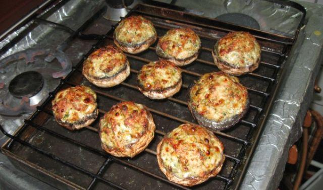 Mod de Preparare: Ceapa se toaca marunt si se caleste in putin ulei, se adauga carnea. Intre timp ciupercile se spala si li se rup piciorusele. Se sareaza si se pipereaza palariutele. Piciorusele se toaca marunt si cand carnea este aproape facuta, se pun si ele in tigaie sub capac. Se umplu ciupercile cu carne si se aranjeaza in tava. Se dau la cuptor pentru 30 minute, dupa care se scot si se aranjeaza pe fiecare cascaval ras. Se mai dau la cuptor 20 min.