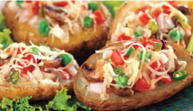 Mod de Preparare: Taiem kaizerul cubulete, ceapa si ardeiul ii tocam marunt. Punem kaizerul la prajit intr-o tigaie teflonata, fara ulei (o sa se topeasca din grasimea lui). Cand e aproape prajit, adaugam ceapa si ardeiul si mai lasam cateva minute sa se caleasca impreuna. Adaugam apoi un sfert de cana de apa, sa se inabuse legumele. Cand apa a scazut, adaugam sunculita si apoi ciupercile. Lasam la racit. Curatam cartofii de coaja si ii taiem in 2, pe lungime. Scobim miezul fiecarui cartof cu ajutorul unei lingurite. Pana executat operatiunea "scobit cartofi", umplutura s-a racit, deci adaugam cascavalul ras pe razatoare. Omogenizam. Umplem cartofii cu aceasta compozitie si ii punem intr-o tava unsa cu unt. Peste fiecare cartof asezam o felie de mozzarella si peste presaram oregano. Dam la cuptorul preincalzit vreo 10-15 min, la foc mare, pana se topeste mozzarella si se rumeneste putin.