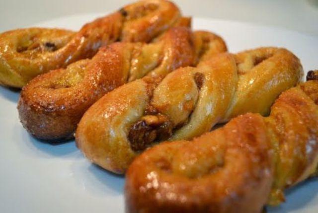 Mod de Preparare: Iar drojdia am dizolvat-o in putina apa calduta. Se face un aluat din cele enumerate mai sus pe care-l lasam la crescut. Intindem pe masa unsa cu ulei aluatul in grosime de 1 cm, pulverizam ulei. Si taiem ca la pizza in 8 buc pe care le suprapunem. Lasam la crescut pt 10 minute. Merele le curatam si taiem in cubulete, peste ele punem 3 lg zahar. Punem pe foc iar cand au lasat destula zeama adaugam 1 lg scortisoara si 1 de amidon amestecand continuu lasam la racit. Din aluatul lasat la crescut intindem o foaie de 0,5 cm peste care adaugam merele racite pliem in 3 si taiem fasii ne 2-3 cm. Le rulam si asezam in tava cu hartie de copt, le ungem cu galbenus de ou amestecat cu putin lapte. Coacem la temperatura mica pt inceput dupa care dam mai tare sa se rumeneasca frumos.