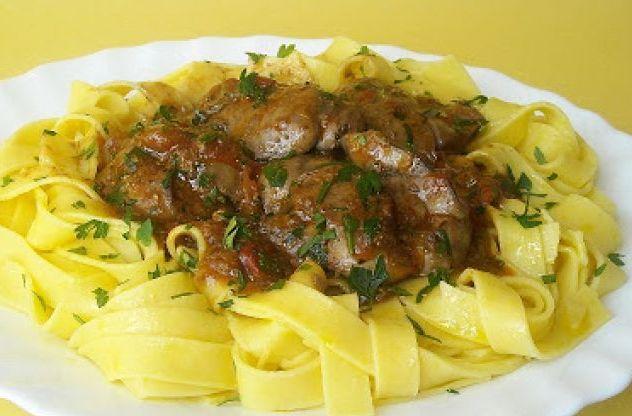 Mod de Preparare: Pastele, tagliatelle se fierb dupa indicatiile de pe ambalaj. Se scot intr-o sita si se trec printr-un jet de apa in asa fel incat sa nu se raceasca. Ficatei de pui se spala, se condimenteaza si se pune la fript intr-o tigaie cu 3-4 linguri de ulei. Se adauga usturoiul si se caleste 2-3 minute, apoi se scoate. Rosiile se taie cubulete si se adauda si ele peste ficatei impreuna cu pasta de tomate. Se lasa cateva minute. Se aseaza pastele pe o farfurie si deasupra se pun ficatei de pui si sos. Se presara busuioc proaspat tocat.