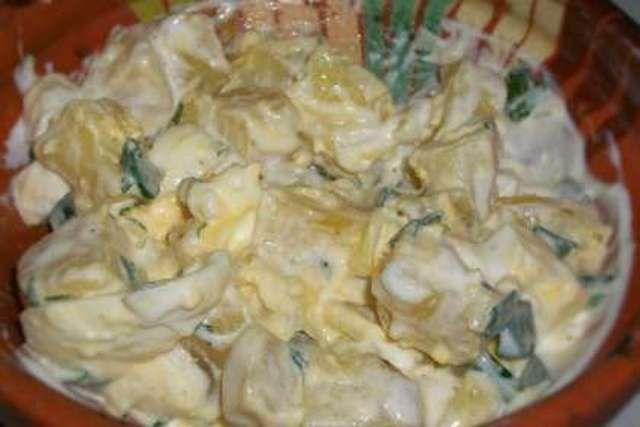 Mod de Preparare: Cartofii se fierb, se lasa sa se racesca dupa care se curata. Maioneza se freaca cu galbenusurile de ou fierte, se amesteca cu smintina, ceva sare, piper si se lasa deoparte. Castravetii se taie marunt, la fel si albusul de ou si se amesteca cu maioneza. Cartofii se taie felii in maioneza si totul se amesteca bine. Daca este necesar se mai aduga zeama de castraveti, sare, piper sau chiar ceva smintina.
