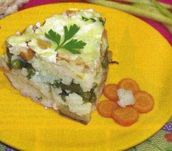 Mod de preparare: Cureti conopida, fasolea verde, morcovii si guliile si le pui la fiert separat in apa cu sare. Speli apoi orezul, il calesti putin in 2-3 linguri de unt topit, stingi cu o cana de apa si-l lasi sa fiarba inabusit 10 minute. Dupa ce au fiert legumele, le scurg bine, apoi tai cubulete morcovii si guliile si desfaci conopida in buchetele intr-o cratita. Asezi apoi un strat de orez, unul de morcovi, orez, fasole verde, orez, conopida si morcovi. Peste ultimul strat torni smantana, presari putin cascaval si dai mancarea la cuptor pentru 10-15 minute. Cand mancarea e gata o decorezi cu cateva frunze de patrunjel.