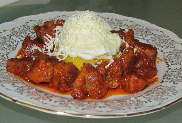 Mod de Preparare: Ceapa curatata se toaca si se caleste cu carnea taiata cubulete. Se adauga sare putina apa si sare. Dupa ce s-a inabusit (si carnea e fiarta) se pun rosiile tocate mai mare, ardeiul, piper, foile de dafin, vinul, boiaua si verdeata. Mai lasi sa se inabuse bine toate ingredientele si pui usturoiul. Cand e gata, servesti, tocana fierbinte cu mamaliguta calda alaturi de un pahar de vin rosu.
