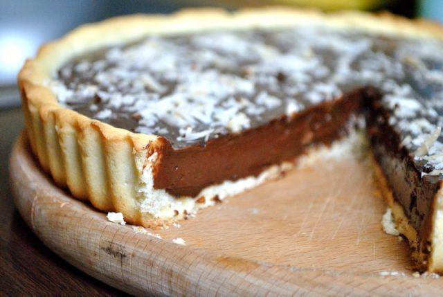 Mod de Preparare: Albusurile se bat spuma cu cele 4 linguri de zahar. Cand am obtinut o consistenta ferma, se adauga si galbenusurile, dupa care se mai mixeaza 2 minute. Ciocolata se rupe in bucatele si se topeste in cele 2 linguri de lapte. Ciocolata topita se adauga peste oua. Se mixeaza 2 minute. Faina, praful de copt, cele 2 lingurite pline de cacao si un varf de cutit de sare se amesteca. Cele doua compozitii se omogenizeaza. O tava pentru tarta se unge cu unt, margarina sau ulei si se tapeteaza foarte bine cu faina. Compoztia de tarta se pune in tava. Tava se da la cuptorul preincalzit pentru aproximativ 15-10 de minute, la foc domol. Se poate verifica daca este gata cu ajutorul unei scobitori. Tarta se va scoate cat mai rapid din tava, cat timp mai este calda, pentru a nu i se deteriora forma, aceasta in caz ca se raceste si se lipeste de tava. Se lasa la racit. Crema se prepara extrem de usor. Frisca se bate spuma. Branza se mixeaza cu zaharul si cu iaurtul. Cand devine cremoasa se adauga frisca si coaja rasa de lamaie. Blatul de tarta se insiropeaza. Eu am folosit un sirop facut din 2 linguri zahar, 2 linguri apa si 1 lingurita suc de lamaie. Crema se intinde in adancitura tartei. Se orneaza dupa preferinta. A retinut o particica din crema in care am adaugat crema de ciocolata.