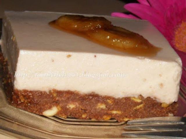 Mod de Preparare: Piscoturile le-a faramat si le-am amestecat cu fulgii de porumb, cu alunele si cu laptele praf. Se adauga untul topit si ciocolata topita si se amesteca totul bine. Cadrul de prajitura la marimea 20/25, l-am pus direct pe platoul pe care ramane prajitura si am asezat apoi compozitia de blat cu lingura, presand bine. Blatul se pune la rece. Bananele taiate si facute pasta prin blender, apoi stropite cu zeama de lamaie. Iaurtul se amesteca cu zaharul, cu pireul de banane, cu frisca batuta si apoi cu gelatina hidratata in apa calda. Crema am intins-o peste blat si am dat la rece cateva ore. Se desface cadrul si se taie in patrate si apoi in triunghiuri fiecare cum vrea. Am caramelizat doua lg de zahar si am pus in el cateva felii de banana se intorc pe o parte si pe alta apoi se scot pe farfurie, cand sunt destul de reci se pun deasupra.