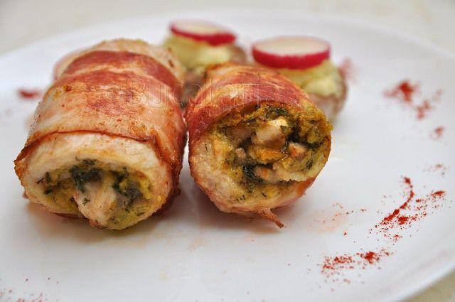 Mod de Preparare: O cină simplă de preparat pentru o seară în compania prietenilor şi a celor dragi. Iată cum să prepari rulouri de pui în bacon cu ciuperci. Se taie bucata de piept de pui în 4, apoi fiecare bucată se taie şi se întinde ca o foaie. Se pudrează cu sare şi piper. Se pun deasupra fiecărei ciuperci tocate, apoi se rulează şi se înfăşoară în bacon. Rulourile se prind cu scobitori şi se presară cu condimente pentru friptură. Se pun într-o tavă tapetată cu hârtie de copt şi unsă bine cu ulei, apoi se dau la cuptor până se rumenesc frumos. Se întorc de câte ori e nevoie. Brânza cu mucegai se taie bucăţele care se pun cu smântâna de gătit la foc mic, până se formează un sos. Se pun şi ciupercile feliate şi se mai adaugă sare dacă e nevoie. Se lasă să mai dea un clocot şi se trage de pe foc. Într-o tigaie fără mâner se pune sosul alb cu ciuperci, apoi se adaugă rulourile care s-au gătit complet, se pun câteva roşioare cherry, se presară un pic de pătrunjel şi se dă vasul la cuptorul încins pentru 10 minute. Se serveşte imediat.
