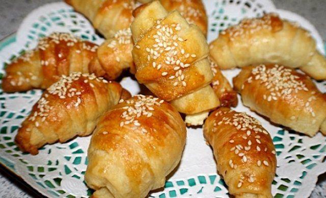 Mod de Preparare: Fierbeti cartofii in apa sarata 25 minute. Incingeti cuptorul la 200 grade. Scurgeti catofii si faceti piure. Adaugati unt, faina, praf de copt, sare si piper si faceti o coca. Impartiti-o in doua si formati pe o planseta fasii de jumatate cm grosime. Taiati fiecare parte din coca in triunghiuri. Sfaramati branza si amestecati cu patrunjel. Puneti cate o lingurita de branza pe marginea mai larga si rulati. Ungeti cu ou si presarati seminte de susan. Coaceti intr-o tava acoperita cu hartie de copt pentru 20 minute pana devin aurii.