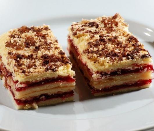 Mod de preparare: Faina se amesteca cu apa minerala, bicarbonatul stins cu zeama de lamaie si uleiul. Nuca macinata se amesteca cu cacaua si scortisoara, apoi cu nuca taiata si dulceata de visine, pe care le punem in aluat. Compozitia obtinuta se coace la un foc potrivit. Dupa ce s-a copt se taie si se pudreaza cu zahar.
