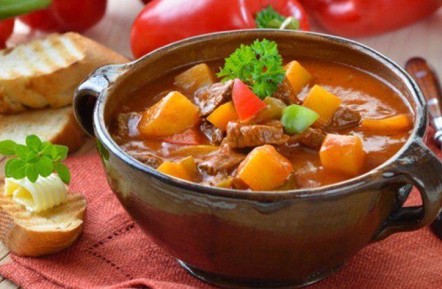 Mod de preparare: Carnea pentru gulaș se taie cuburi care se trec prin făină. Într-o cratiță se topește untura și se pune la călit ceapa tăiată peștișori. După ce începe să devină sticloasă, se adaugă carnea. Se lasă să se rumenească bine și apoi se pun bulionul, roșiile tăiate și usturoiul pisat. Se presară boia, se toarnă vinul și supa. Se sărează și se piperează, se adaugă chimenul și ardeii. Se acoperă și se lasă să fiarbă o oră. Se adaugă cartofii cuburi și se mai lasă la foc timp de o oră. Se servește cu pătrunjel.