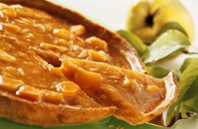 Mod de Preparare: Se incepe cu spalatul si decojitul gutuilor, apoi se curata de cotoare si se taie in cubulete. Se stropesc cu zeama de lamaie si se lasa deoparte. Portocala se stoarce, sucul acesteia amestecandu-se cu sucul de lamaie si cel de portocale rosii; se pun intr-o craticioara la fiert impreuna cu zaharul; cand zaharul s-a topit si lichidul a dat in fiert se pun gutuile unde se lasa pana se inmoaie putin. Se scot gutuile din zeama si se pun la racit. Intre timp preparam aluatul, amestecand faina cu untul, zaharul si coaja de lamaie rasa, sarea si apa. Se framanta bine pana se obtine un aluat omogen. Aluatul se intinde intr-o forma de tarta, ridicandu-l si pe margini.Tava se da la frigider. Cand fructele si zeama s-au racit se scoate tava din frigider si se repartizeaza gutuile pe toata suprafata acesteia. Ouale se bat bine cu smantana, se adauga zeama si se desarta peste gutuile din tava. Se da tava la cuptorul incins si se coace aproximativ 30 - 40 minute la foc mic. Depinde de cuptorul fiecareia, important este ca amestecul sa se inchege bine. Mierea se amesteca cu scortisoara si cu o pensula se unge tarta. Se mai lasa in cuptorul stins 10 minute.