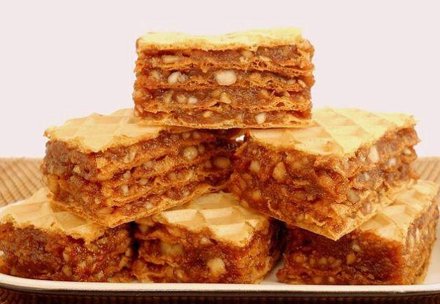 Mod de preparare: Se caramelizează zahărul, pe foc mic, se stinge cu lapte și apoi se adaugă untul tăiat bucăţele, făina treptat, amestecând permanent, iar la sfârșit se adaugă alunele (sau nucile) măcinate. Separat, se bat ouăle cu zahărul pudră și cu pudra de cacao, se amestecă cu compoziţia anterioară și se fierb împreu-nă, în bain-marie, aproximativ 10 minute, amestecând permanent. Se lasă la răcit.Se ung foile de napolitană cu crema caramel, se așază una peste alta și se lasă la frigider 1-2 ore, apoi se taie și se așază pe un platou.
