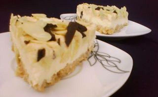 Crema: Se face budinca conform instructiunilor de pe plic, se imparte in doua. O parte se amesteca cu iaurtul si cealalta cu nuca de cocos. Se pun in forma peste blatul de napolitane si se da la rece. A ornat cu fulgi de migdale si ciocolata.