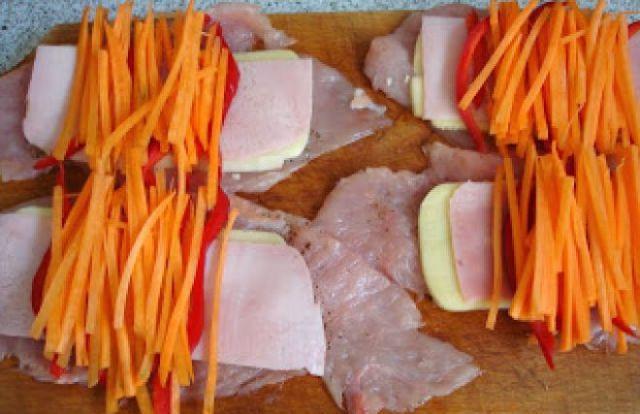 Mod de Preparare: La aceasta reteta nu dau cantitatile; luat un piept de curcan si taiat din el 5 felii mai groase, batut putin cu ciocanul de carne, condimentat fiecare felie cu sare si piper. Deasupa fiecarei feii pus cate o felie subtire de cascaval si cate o felie de sunca presata. Un morcov taiat bastonase subtiri; la fel taiat si ardeiul rosu. Luat cate putin din fiecare si pus peste feliile de unce. Rulat cat mai strans si invelit fiecare piept de curcan cu doua felii de kaizer pe care fixat cu ajutorul a doua scobitori.Uns un vas de cuptor cu putin unt, pus morcovul si ardeiul ramas si deasupra aranjat rulourile. Peste rulouri ras cascaval, acoperit tava cu folie de aluminiu si dat la cuptor. Dupa 40 de minute scos folia de aluminiu si mai lasat rulourile in cuptor 20 minute. Servit alaturi de morcovii sotati din tava si cartofi prajiti in tigaie.