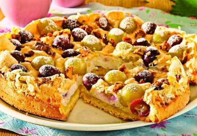 Mod de preparare: Făina se amestecă ușor cu praful de copt, bicarbonatul și un praf de sare. Se amestecă 3/4 din cantitatea de zahăr, 100 g unt, ouăle și uleiul și apoi se omogenizează cu făina. Se adaugă esenţa, coaja de lămâie și vinul în trei reprize. Se toarnă aluatul într-o formă de copt unsă cu ulei, tapetată cu hârtie și stropită și aceasta cu ulei, se pun boabele de struguri deasupra și se lasă la cuptor 20 de minute. Se scoate, se pun restul untului și restul de zahăr peste struguri și se mai lasă la cuptor 20 de minute.