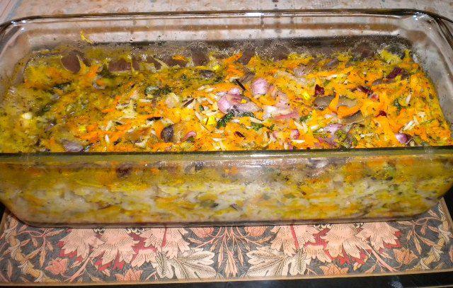 Mod de Preparare: Orezul se spala, morcovii se dau prin razatoarea mare, ceapa, usturoiul si ciupercile se taie marunt. Se amesteca toate ingredientele impreuna cu patrunjelul verde tocat, cimbrul uscat, sarea si pesmetul. Se face o compozitie omogena care se pune intr-o forma de cozonac in cateva linguri de ulei apoi se toarna apa in asa fel incat sa acopere mixtura de legume. Se da la cuptor 50-60 de minute la foc potrivit si se completeaza cu apa atunci cand scade prea mult. In final trebuie sa iasa scazuta. Se serveste atat rece cat si cald.