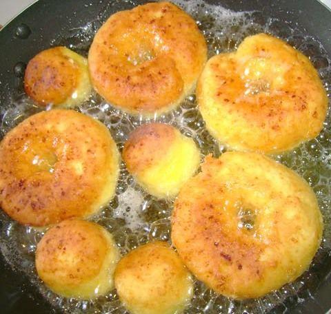 am format bilute din aluat, i-am dat fiecareia o forma rotunda si plata de chiftea, in mijloc am facut cate o gaura, cateva bilute le-am lasat mici si rotunde; se pun intr-o tigaie in ulei, neanghesuiti, si se prajesc pe ambele fete; I-am servit cu smantana si cu dulceata de capsuni.