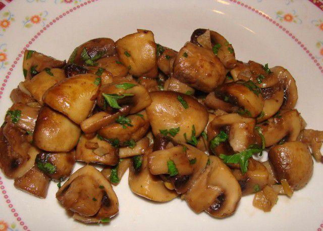 Mod de preparare: Uleiul se încinge într-o tigaie, la foc mic. Se adaugă usturoiul şi se căleşte 1 minut, până începe să se înmoaie. Se pun ciupercile. Se gătesc 10 minute în ulei, apoi se adaugă vinul. Se lasă pe foc 15-20 de minute, până se evaporă apa lăsată şi ciupercile capătă o culoare arămie. Din când în când se amestecă, având grijă să nu se prindă de cratiţă. Când sunt aproape gata, se potrivesc de sare şi piper. La final se adaugă pătrunjelul. Ciupercile se servesc calde.
