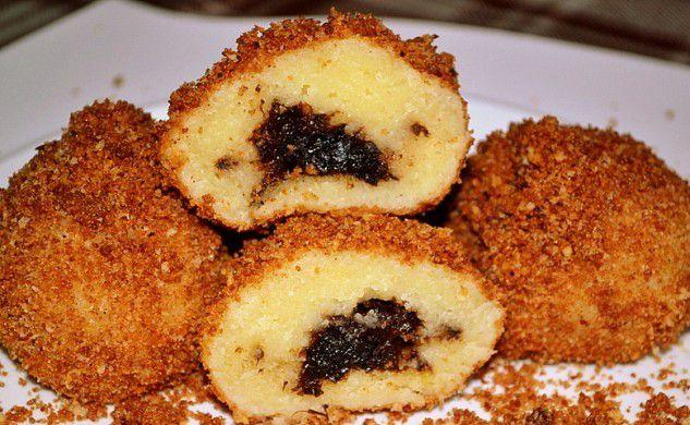 Mod de preparare: Vinul se fierbe, se îndulceşte după gust şi se aromează cu coaja de lămâie. Se adaugă prunele uscate, spălate, se lasă să dea câteva clocote, apoi se acoperă şi se lasă 3-4 ore, să se înmoaie. Dacă au sâmburi se curăţă şi se lasă la scurs într-o strecurătoare. Cartofii fierţi se zdrobesc şi se amestecă cu uleiul. Când se răcesc, se adaugă făina şi oul. Se amestecă până se omogenizează, apoi se întinde într-o foaie groasă de 2 – 3 cm, care se împarte în 12 bucăţi. Prunele scurse se dau prin pesmet şi se îmbracă în aluat. Se dau prin făină şi se pun pe rând într-o oală de 3 l cu apa clocotită. Se lasă să fiarbă acoperit, la foc mic, 10 – 15 minute, apoi se ia de pe foc şi se mai lasă acoperite, încă 15 minute. Găluştele fierte se scot din apă şi se lasă la scurs. Se tapetează cu pesmet rumenit în unt şi nucă pisată, apoi se pudrează cu zahăr.