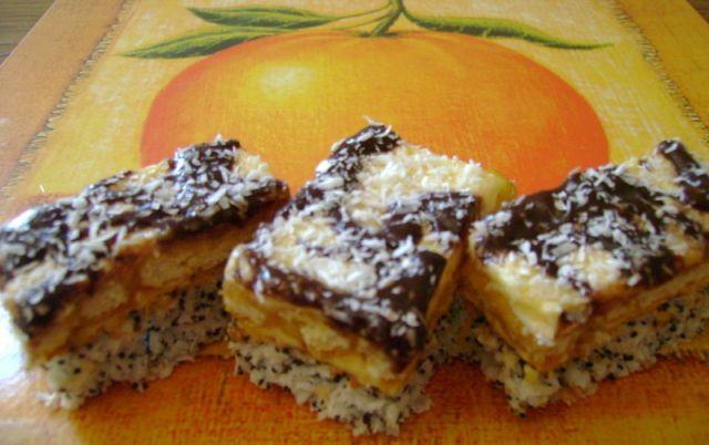Mod de Preparare: Pentru blat, apa se amesteca cu zaharul pana se dizolva, adauga pe rand faina amestecata cu praful de copt, uleiul, mierea si esentele, pana se omogenizeaza aluatul. Toarna aluatul intr-o tava unsa cu ulei si tapetata cu faina si da la cuptorul preincalzit, la foc mediu spre mare. Intre timp, pune laptele la fiert cu zaharul vanilat, iar cand clocoteste adauga grisul in ploaie, amestecand continuu, la foc mic. Lasa sa fiarba pana se ingroasa, apoi imparte crema in 2. Pune zaharul brun la caramelizat, apoi amesteca-l cu o parte din crema de gris. Scoate blatul din cuptor cat inca nu e gata, dar destul de tare ca sa poti pune mana pe el, toarna deasupra crema simpla de gris, apoi pe cea caramelizata si da din nou la cuptor, la foc mai mediu, pentru 10-15 minute. Pentru glazura, pune la fiert apa cu zaharul. Dupa ce se ingroasa si incepe sa-si schimbe culoarea, pune esenta de rom, nucile si fulgii de migdale si mai lasa cateva minute pe foc. Scoate prajitura de la cuptor, toarna deasupra glazura si mai lasa pentru inca 10 min la cuptor. Se lasa sa se raceasca 15-20 de minute inainte de taiere.