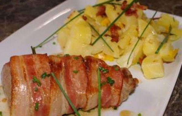 Mod de Preparare: Cartofii ii curatam de coaja si ii taiem cubulete sau doar ii taiam in jumatate. Ii punem intro oala cu apa care clocoteste si in care am pus o lingurita de sare. Lasam la foc mediu sa se fiarba circa 8-10 minute. Intre timp, spalam bine muschiuletul de porc, il taiem in doua bucati egale, scoatem grasimea si pielitele de pe el, il asezonam si il punem deoparte. Cand cartofii s-au fiert (dar nu de tot), ii scoatem si ii scurgem de apa. Ii punem intrun vas Jena, presaram un pic de sare si cateva frunzulite de rozmarin. Luam o tigaie, punem 1 lingura de ulei de masline la incins si cand totul e fierbine, punem usturoiul zdrobit (tocat) si cateva frunze de rozmarin proaspat. Peste ele, punem muschiuletul de porc si incepem sa-l prajim la foc mare, cateva minute dupa care il intoarcem pe partea cealalta. Pana se prajeste muschiuletul de porc, pregatim baconul in asa fel incat sa infasuram muschiuletul cu feliile de bacon. Dupa ce i-am infasurat, ii punem inapoi in tigaie, iar tigaia o introducem in cuptorul care deja a fost incins la 220ºC! Turnam si sosul care s-a format in tigaie la prajirea muschiului, peste carne. Incepem sa pregatim cartofii taranesti, pana stau muschiuletii nostri in cuptor. Intr-o alta tigaie, punem 1 lingura de ulei de masline, punem 4 felii taiate in jumatate le punem in tigaie si peste ele aruncam ceapa taiata juliene, si asteptam sa se rumeneasca frumos si baconul si ceapa.
