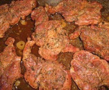 Intr-o tigaie cu unt topit si ulei incins se innabusa pe ranf feliile de carne, pe ambele parti, apoi se scot intr-un vas termorezistent;