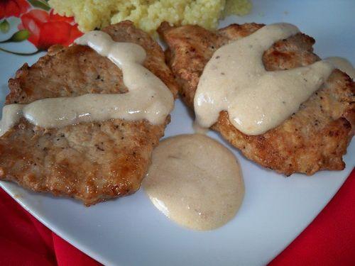 Ingrediente: 500 g muschi de porc (sau piept de pui dezosat), 2 linguri unt, cca. 10 boabe piper, smantana dulce grasa cca. 200 ml.