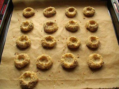 Aluatul se intinde intr-o foaie de 4-5 mm si se taie rondele, se aseaza intr-o tava tapetata cu hartie de copt, iar deasupra pe fiecare fursec se pune cate o lingurita din compozitia de bezea si cate o jumatate de nuca. Se coace la cuptorul incins, la foc potrivit, 15-20 min.