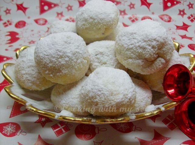 Ingrediente: 2 cani de faina alba, 1/2 lingurita sare, 1 cana de margarina sau unt nesarat, 1/2 cana zahar granular (tos), 1 esenta de vanilie, 1 cana de nuci fin macinate, 1 cana de zahar pudra.