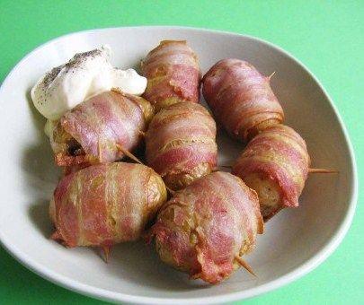 Ingrediente: 8 felii de bacon, 2 cartofi rosii, lunguieti, 8 lingurite ulei de masline, rozmarin, sare, piper.