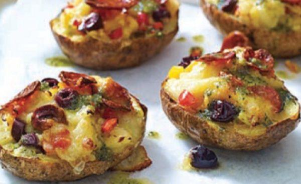 Mod de preparare: Încinge cuptorul la semnul 6/200°C. Înțeapă cartofii din loc în cu furculița și unge-i cu ulei. Presară sare și piper și dă-i la cuptor 1 oră până când se pătrund în interior. Sau dă-i la microunde la temperatura maximă 10 minute. Taie cartofii pe jumătate și scoate cu lingurița pulpă din mijloc, lăsând o margine de 1 cm de jur-împrejur. Zdrobește și combină cu uleiul de măsline, ardeiul, sosul pesto. Umple cartofii cu amestecul și așază deasupra cașul și roșiile. Dă la cuptor 15 minute, până când se încălzesc complet și cașul se topește.