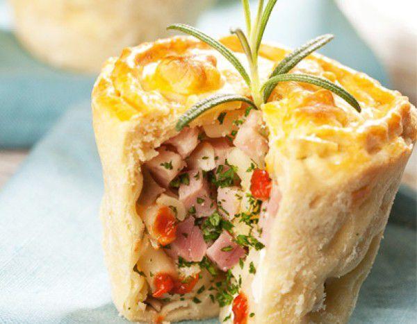 Mod de Preparare: Se freacă untul cu un praf de sare și cu ouăle. Se adaugă iaurtul și se presară făina. Se frământă ușor și se păstrează la rece. Se încing 2 linguri de ulei și se prăjește ardeiul tocat mărunt. Se adaugă șunca tăiată cubulețe și pătrunjelul tocat. Se presară piper și se oprește focul. Se întinde aluatul. Se taie de mărimea formelor. Se ung formele cu unt și se pun foile. Se pune umplutura. Se coc 30 minute la foc moderat.