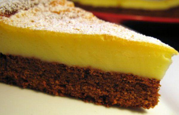 Compozitia de branza: In timp ce compozitia cu cacao este la cuptor, se prepara compozitia cu branza. Smantana lichida se incalzeste si se toarna peste ciocolata. Se lasa cateva minute, apoi se mesteca pana la omogenizare. Se amesteca toate ingredientele: oua, zahar, branza, smantana groasa, smantana lichida amestecata cu ciocolata, unt, amidon, vanilie. Se toarna compozitia peste blatul de cacao si se da la cuptor inca 50 de minute (cand o scoateti, mijlocul se misca usor). Se taie cand e rece.