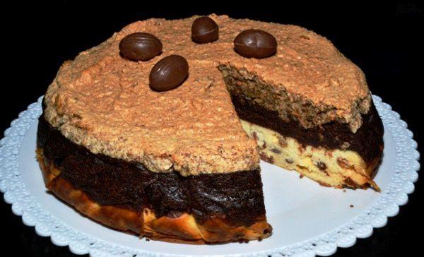 Pentru al doilea strat mixati bine galbenusurile cu zaharul pudra si cel vanilat pana devin o crema spumoasa. Adaugati smantana. Amestecati faina cu cacaua si adaugati-o treptata in compozitie. Turnati amestecul peste primul strat din pasca (dupa ce s-au scurs cele 40 minute) si lasati la cuptor 30 minute tot la 180 grade. Pentru al treilea strat bateti albusurile spuma cu zaharul. Cand isi tripleaza volumul adaugati nuca macinata. Turnati bezeaua peste al doilea strat. In prelungirea tavii veniti cu o bucata de hartie pentru copt pentru a creste frumos. Lasati tava in cuptor 30 minute la 170 grade. Scoateti tava din cuptor, indepartati marginea tavii si hartia de copt si lasati-o la racit.